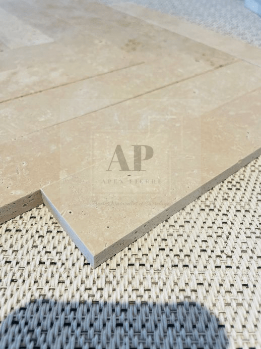La pose chevrons, ou pose en quinconce, est idéale pour ajouter du dynamisme à vos espaces tout en mettant en valeur la beauté de cette pierre naturelle qui est le travertin. Les nuances délicates du travertin beige s’associent harmonieusement pour un rendu à la fois classique et contemporain, adapté à tous les styles de décoration.