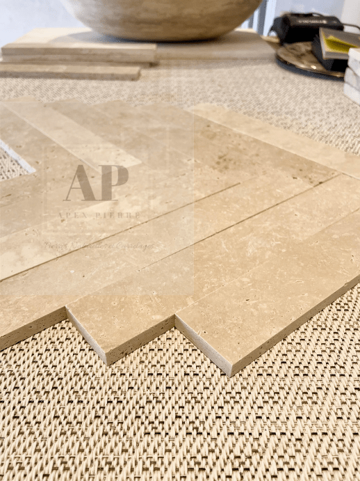 La pose chevron en pierre naturelle, également appelé pose bâton rompu, se caractérise par un motif en V inversé, formant un élégant effet zigzag qui ajoute une touche sophistiquée à vos sols. Grâce à ses  nuances allant du beige au beige clair, ce carrelage apporte une luminosité et une douceur incomparables, s’adaptant aussi bien aux intérieurs qu’aux extérieurs.